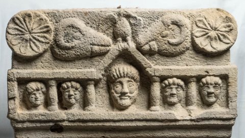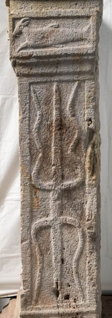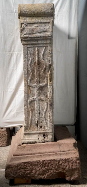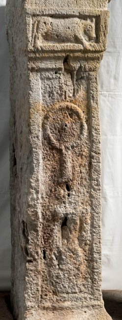 - Pulvini mit Rosetten, dazwischen zwei Widderköpfe und Adler, der auf dem Giebel eines Bildfeldes mit männlichem Kopf sitzt. Seitlich von diesem je zwei kleinere Felder zwischen Säulchen, darin je ein Kopf. Inschrift von Weinranken umgeben. Auf den Nebenseiten links oben Stier, darunter Opfergefäße (Paters, Kanne). Rechts oben Capricorn, darunter Blitzbündel.