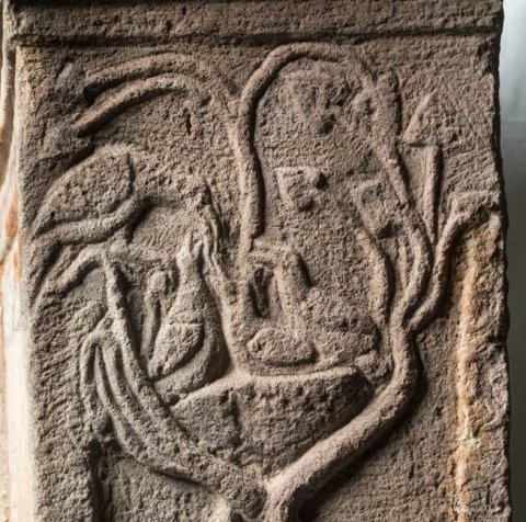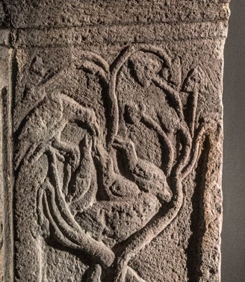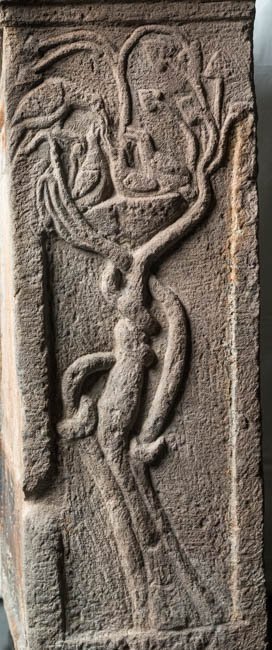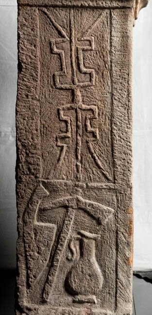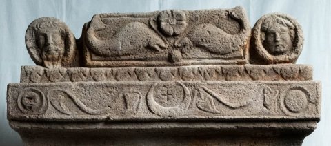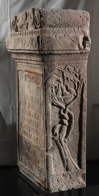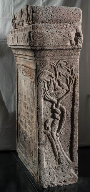 - Pulvini mit Masken, dazwischen eckiger Aufsatz mit zwei Delphinen und Rosette. Auf dem Rand der Deckplatte Mondsichel zwischen Ranken und runden Scheiben. Schriftfeld von Ranken umgeben. Auf den Nebenseiten links Blitzbündel, darunter Werkzeug (Axt, Messer) und Kanne, rechts Baum mit Vogelnest und Schlange.