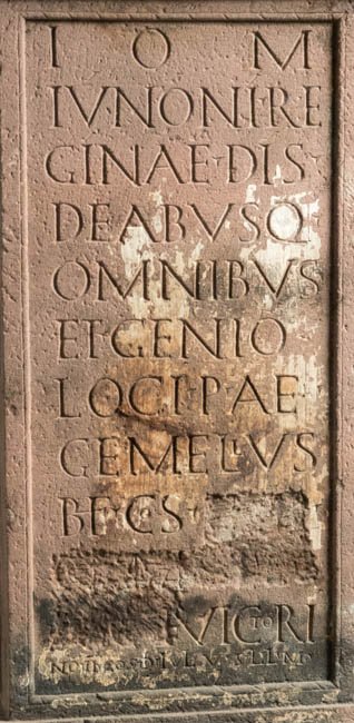 - I(ovi) O(ptimo) M(aximo) / Iunoni Re/ginae dis / deabusq(ue) / omnibus / et Genio / loci P(ublius) Ae(lius) / Gemellus / b(ene)f(iciarius) co(n)s(ularis) [[Imp(eratore)]] / [[[Commodo]]] / [[[Aug(usto) et]]] Victori/no II co(n)s(ulibus) Id(ibus) Iul(iis) v(otum) s(olvit) l(ibens) l(aetus) m(erito)