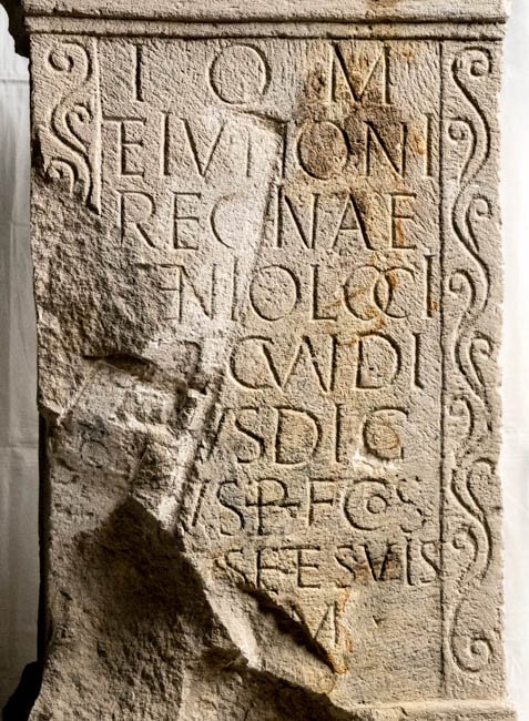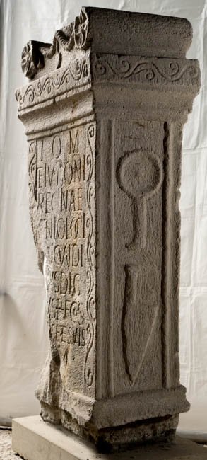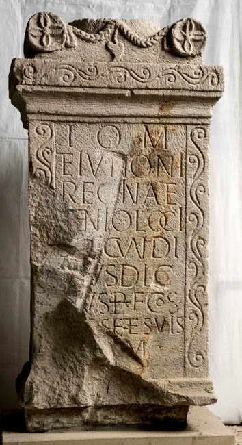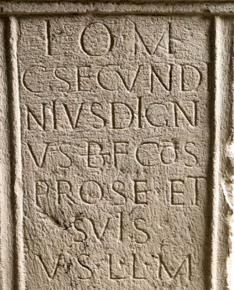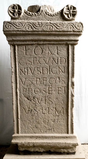 - I(ovi) O(ptimo) M(aximo) / et Iunoni / Reginae / Genio loci / [C(aius) S]ecundi/[ni]us Dig/[n]us b(ene)f(iciarius) co(n)s(ularis) / [pr]o se et suis / [v(otum) s(olvit) l(ibens) l(aetus)] m(erito) // I(ovi) O(ptimo) M(aximo) / C(aius) Secundi/nius Dign/us b(ene)f(iciarius) co(n)s(ularis) / pro se et / suis / v(otum) s(olvit) l(ibens) l(aetus) m(erito)