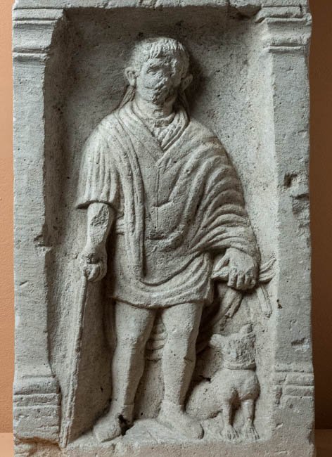 - Eingeschriebener Giebel mit Rosette, Palmettenakrotere und Tänien auf den Giebelschrägen. Unter dem Giebel Schriftfeld, darunter Bildnische zwischen glatten Pilastern. Stehendes Kind (Knabe) in Tunica, Paenula, Halstuch und Schuhen, in der Linken Leine eines beim linken Fuß sitzenden Hundes.
