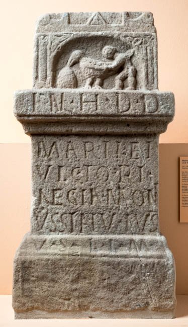 - In h(onorem) d(omus) d(ivinae) // Marti et / Victori/ae Giamoni/us Statutus // v(otum) s(olvit) l(ibens) l(aetus) m(erito)