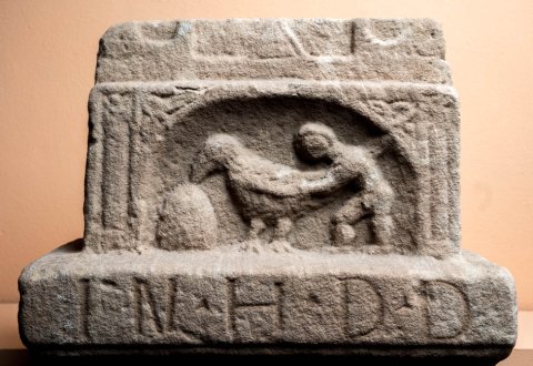- Kubischer Aufsatz, auf dessen Vorderseite von Pilastern flankierte Bogennische, darin Erot und großer Vogel (Rabe ?), vor ihm Bienenkorb-förmiges Objekt. Über dem Bogen angedeutete pulvini, dazwischen Giebel. Auf den Nebenseiten Rechteckfeld mit Akanthusornament.