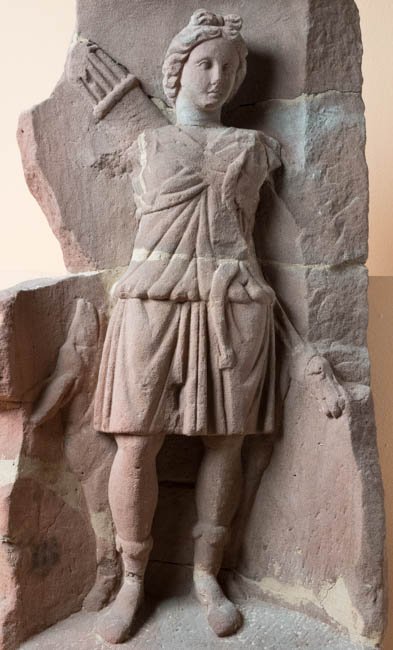 - Mythische Figur: Diana in kurzem Chiton und Stiefeln, über der rechten Schulter Köcher, hinter dem rechten Bein Hund, hinter dem linken Hirschkuh ?