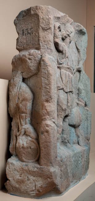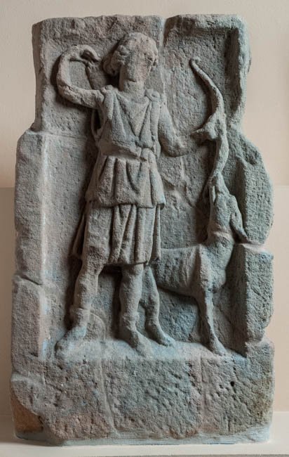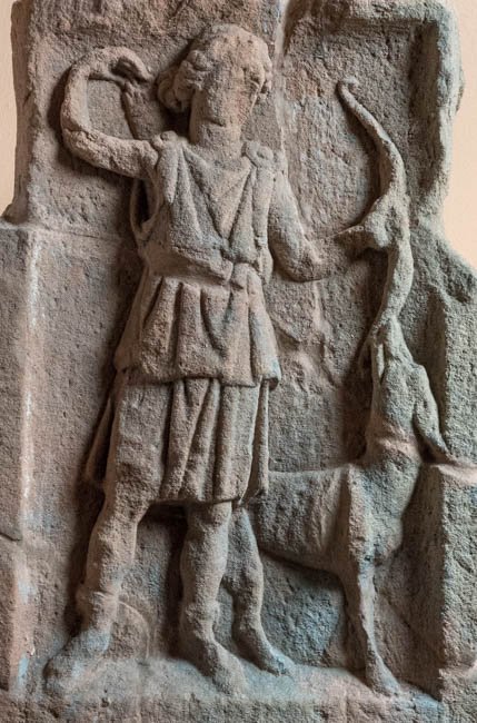- Mythische Figuren: auf der vollständig erhaltenen Seite Diana mit Bogen in der Linken, die Rechte greift nach dem Köcher. Neben ihr Hund. Auf der links anschließenden Seite Victoria, auf der rechts anschließenden Mercur(?).