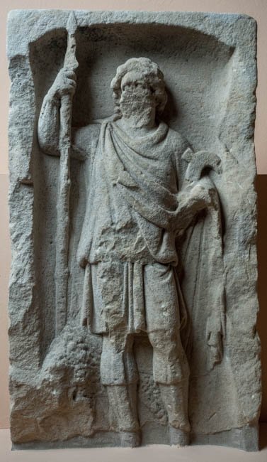 - Mythische Figur: Silvanus mit langem Stab in der Rechten, im linken Arm Winzermesser. Neben dem rechten Bein Tier.