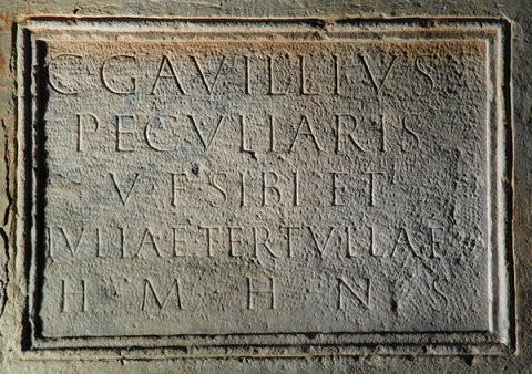 - C(aius) Gavillius / Peculiaris / v(ivus) f(ecit) sibi et / Iuliae Tertullae / h(oc) m(onumentum) h(eredem) n(on) s(equitur)