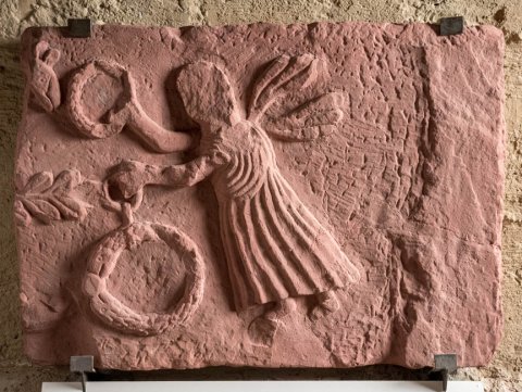 - Mythische Figur: schwebende Victoria mit Kränzen in den Händen. Rechter Teil einer Inschrifttafel ?