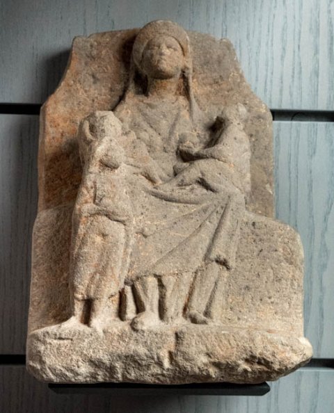 - Mythische Figur: thronende Göttin mit über den Kopf gezogenem Mantel und zwei Kleinkindern im Arm. An ihr rechtes Bein gelehnt stehendes Mädchen.