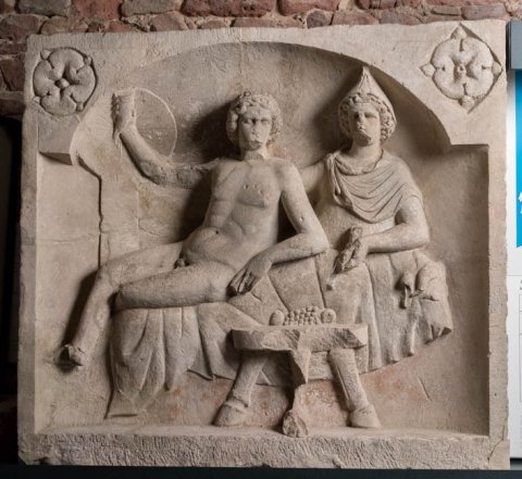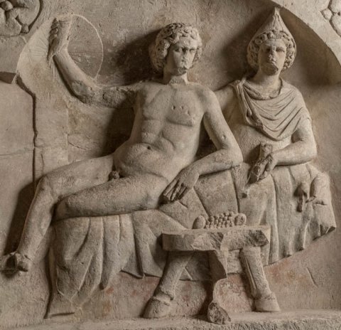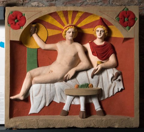 - Mythos: Mithras und Sol beim Mahl, gelagert auf einer Stierhaut mit Kopf, aber ohne Beine, davor Tischchen mit drei Stierfüßen.