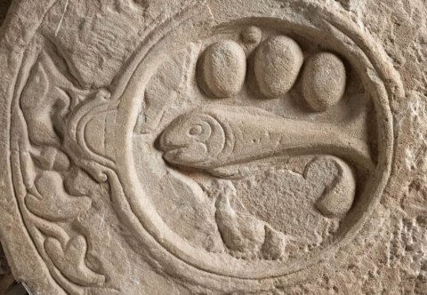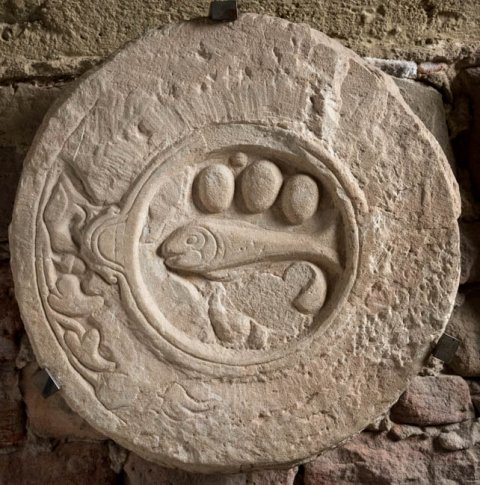 - Runde Tischplatte mit vertieftem runden Feld in der Mitte, darin Fisch und Eier (Früchte ?). Auf dem äußeren Rand Efeuranke und Vogel. Kulttisch aus einem Heiligtum ?