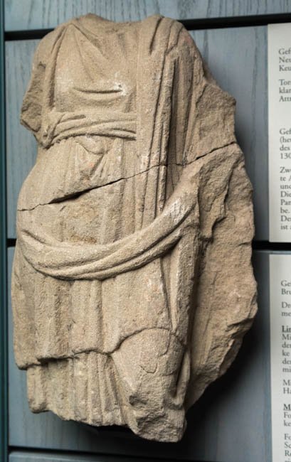 - Mythische Figur: stehende Göttin in Gewand mit langem Überschlag und Mantel. Juno ?
