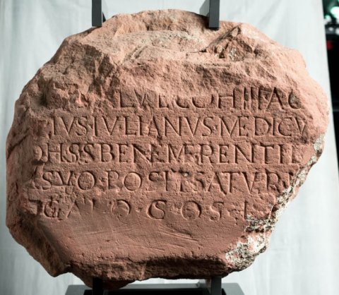 - ---] / [pr]o salute coh(ortis) III Aq[uit(anorum)] / [---]pius(?) Iulianus medicu[s] / [c]oh(ortis) s(upra) s(criptae) bene merentib[us] / [d]e suo pos(u)it Saturn[ino] / [e]t Gal(l)o co(n)s(ulibus) l(ibens) [m(erito)]