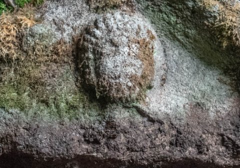 - Stele mit offenem Giebel, darin Kopf einer Frau mit Melonenfrisur