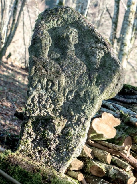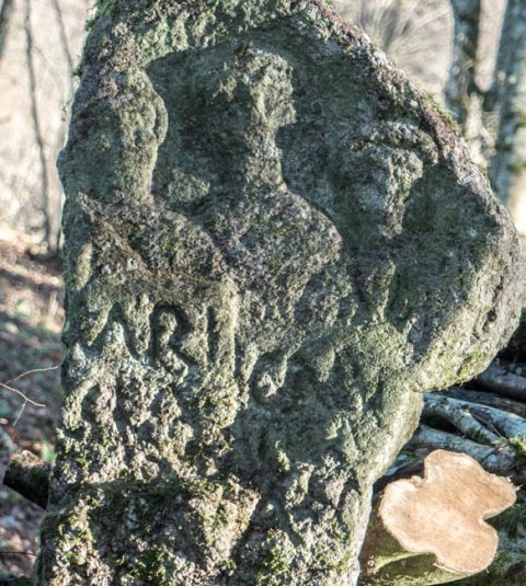 - Stele mit offenem Giebel, darunter Büsten von drei Personen (Familie, links Frau, in der Mitte Mann, rechts Kind?). Unterhalb der Bildnische Inschrift.