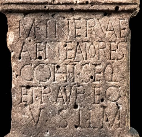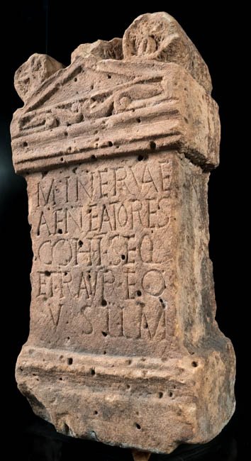 - Minervae / aeneatores / coh(ortis) I Seq(uanorum) / et Raur(icorum) eq(uitatae) / v(otum) s(olverunt) l(ibentes) l(aeti) m(erito)