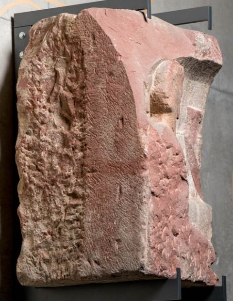- linke obere Ecke des Blockes, Relief großteils abgeschlagen, linke Nebenseite abgemeißelt (oder auf Anschluss gearbeitet ?)