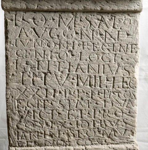 - In h(onorem) d(omus) d(ivinae) // I(ovi) O(ptimo) M(aximo) salu(t)iq(ue) / Augg(ustorum) nn(ostrorum) / Iunoni Regin(a)e / Genio loci / L(ucius) Titianius / Titus mil(es) leg(ionis) / XXII P(rimigeniae) p(iae) f(idelis) be(neficiarius) co(n)s(ularis) / egit stat(iones) duas / Vict(orino) et Pro(culo) / co(n)s(ulibus) IX Idibus / Ian(uariis) inseq(uente) Mu/ciano co(n)s(ule)
