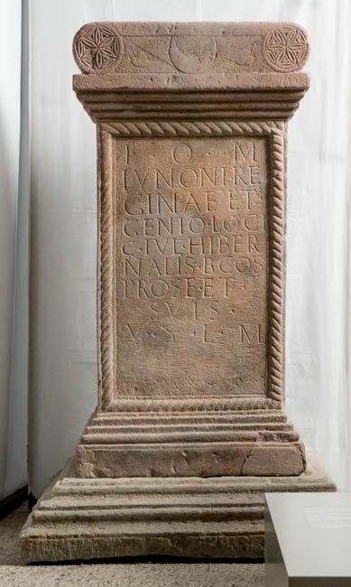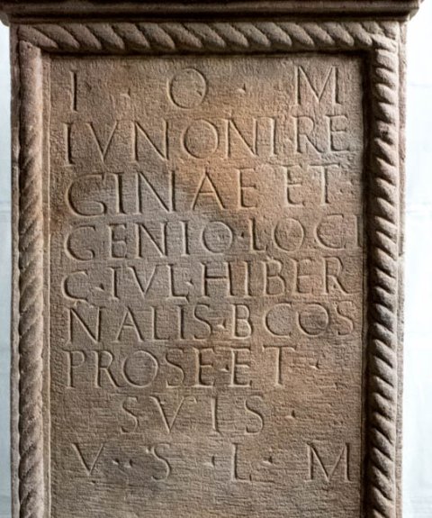 - I(ovi) O(ptimo) M(aximo) / Iun(oni) Re/ginae et / Genio loci / C(aius) Iulius Hiber/nalis b(eneficiarius) co(n)s(ularis) pro se et / suis / v(otum) s(olvit) l(ibens) m(erito)