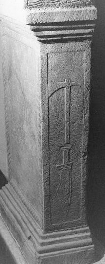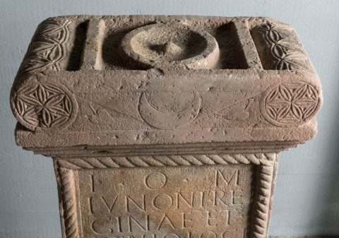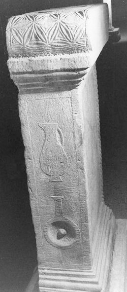 - Ornamentierte pulvini mit Rosetten, dazwischen Mondsichel und Efeublätter. Auf der linken Nebenseite Gefäße (patera, Kanne). Auf der rechten Nebenseite Werkzeug (Axt, Messer).
