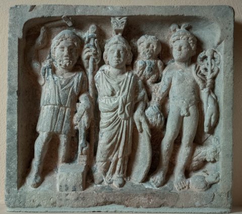 - Mythische Figuren: Vulcan mit Hammer in der erhobenen Rechten, Zange in der Linken, Amboss neben dem linken Fuß. Minerva mit Helm, Schild und Lanze (Szepter ?), auf der Schulter Eule. Mercur mit Flügelkappe, Caduceus im linken Arm, Geldbeutel in der Rechten. Neben dem linken Fuß Schildkröte, hinter dem Bein Hahn.