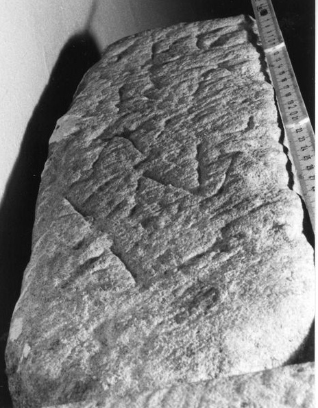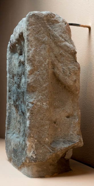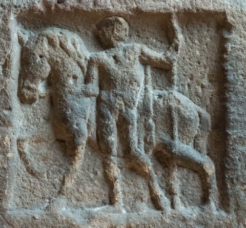 - Mythische Figur: auf der linken Nebensesite Dioskur mit Pferd, in der Linken Lanze. Auf der rechts anschließenden Seite Rest eines Girlandenfrieses (? oder einer geflügelten Figur ?). Auf der linken Seite Inschriftreste: Zwischensockel einer Jupitersäule ?