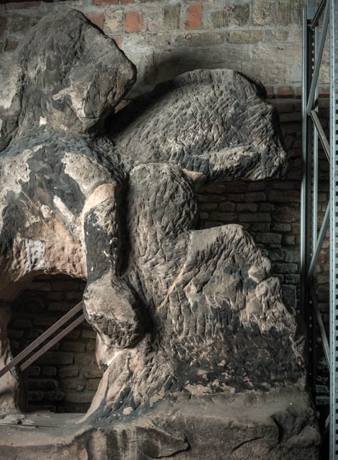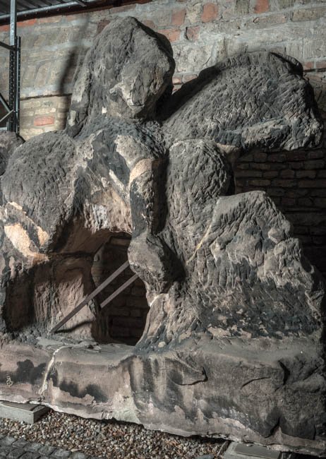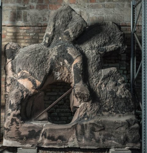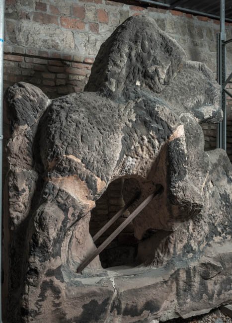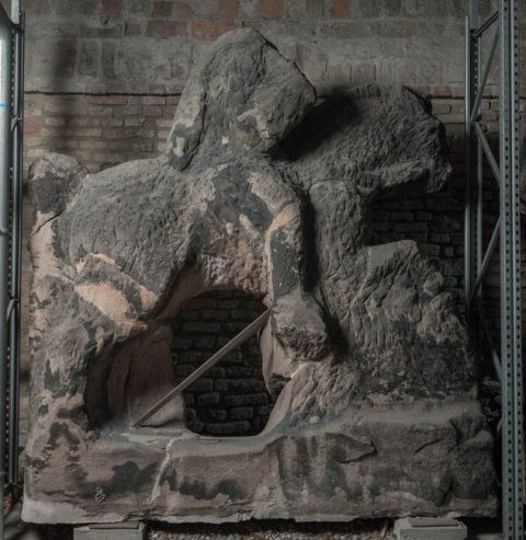 - aus Fragmenten zusammengesetzt, Kopf des Reiters fehlt, unfertig, Oberfläche grob zugehauen