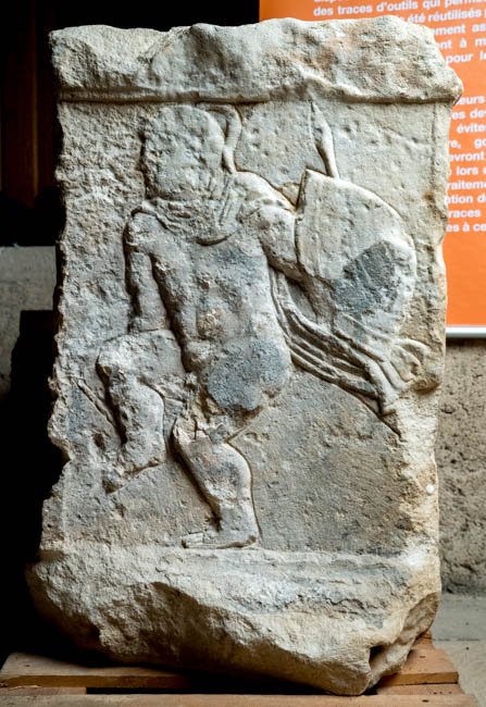 - Mythos: Auf der Vorderseite nackter Krieger mit Helm, Speer und Schild, greift nach dem angehobenen rechten Fuß, in dem ein Pfeil steckt (Achill ?). Auf der linken Nebenseite kniender Daedalus, in der Rechten Werkzeug, in der Linken Flügel. Auf der rechten Nebenseite Kopf und Vorderbein eines liegenden Stiers.