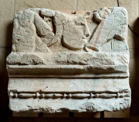 - Fries mit Waffen: Torso mit Panzer, Kopf mit Helm, Beinschienen. Darunter vorspringende Leiste und Fascienzone mit Perlstab.