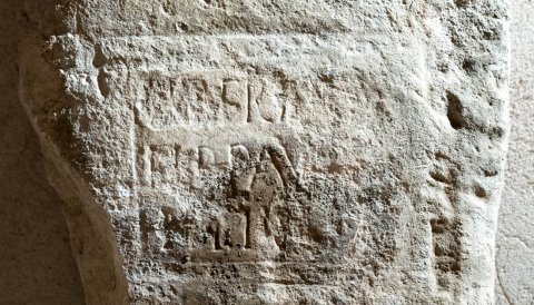 - Stele mit gerahmtem Giebel. Unterhalb des Schriftfeldes Gittermuster.