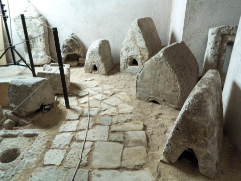 - Grabstein in Form eines Hauses mit Satteldach und kleiner gerahmter Bogennische auf der Frontseite