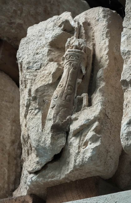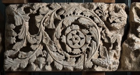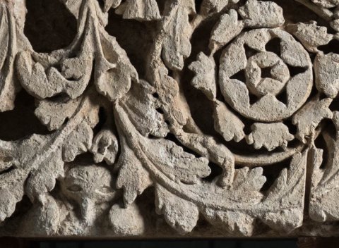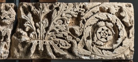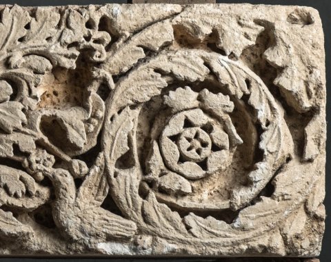 - Friesblock von einer Porticus: Akanthuskelch, von dem Spiralranken ausgehen. Links Erot mit Zweig. Auf der Rückseite Ranken und balusterförmiges Objekt, mit S-Haken verziert (Fackel ?).