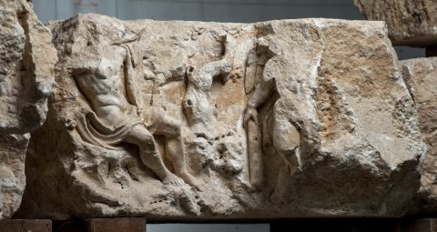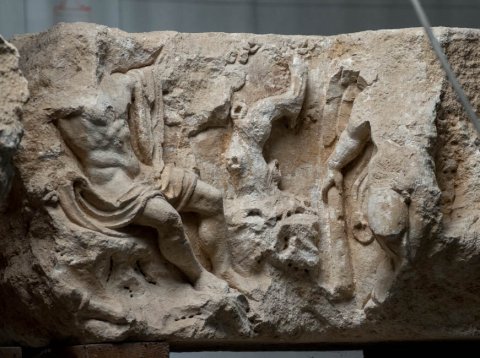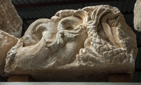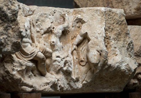 - Teil des Frieses einer Porticus: in Akanthusranken sitzender Mann (Gott ? Heros ?), linker Arm war zu einem Baum erhoben. Rechts auf der linken Seite des vorkragenden Teils des Blockes stehender Erot mit Keule. Auf der Vorderseite Umrisse eines Kopfes. Auf der Rückseite des Blockes Meerwesen und Capricorn.
