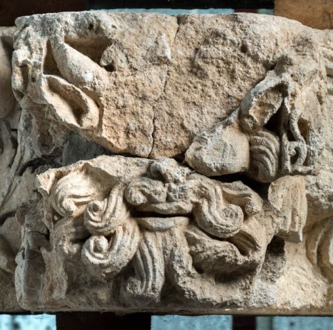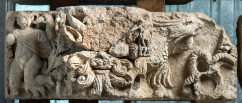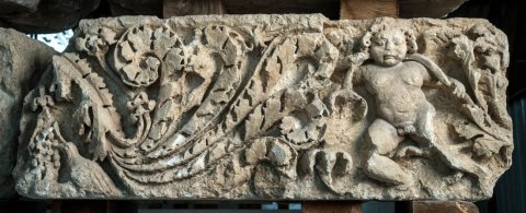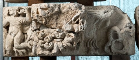 - Block mit vorkragendem Mittelteil, vom Fries einer Porticus. Mythische Figuren: auf dem vorkragenden Teil Acheloosmaske, links davon laufender Erot, rechts Protome eines fliegenden Adlers und Enden von Taenien. Auf der Rückseite Akanthusranken mit Vogel, laufender Erot.
