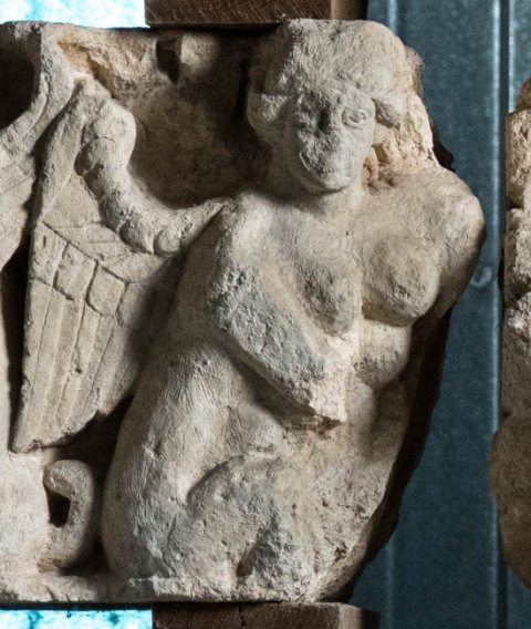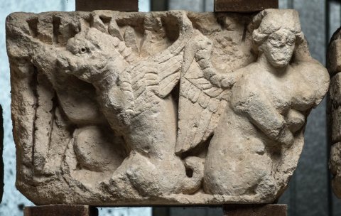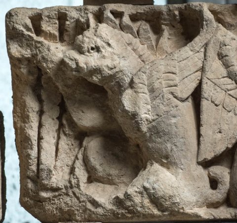 - Reliefblock vom Fries einer Porticus. Mythische Figuren: hockender Greif und hockende Sphinx Rücken an Rücken. Auf der Rückseite Akanthusranken und Eroten.