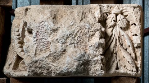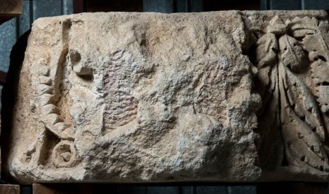 - Reliefblock mit vorkragendem Mittelteil, vom Fries einer Porticus. Links ornamentaler Reliefrest, rechts Akanthusdekor. Auf dem vorkragenden Teil vermutlich Götterkopf (vgl. Nr. 25745, 25748, 25729). Auf der Rückseite Akanthusranken und Eroten.