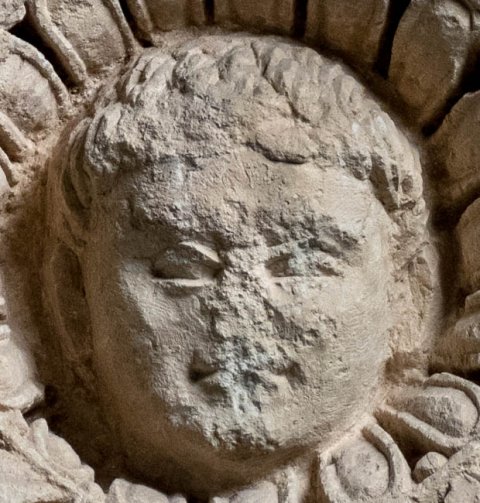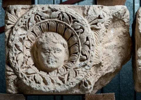 - Reliefblock vom Fries einer Porticus. Medaillon mit profilierten Rahmen (Zungenblattkreis, Rankenfries, außen Zackenband), darin Kopf eines Jünglings oder Knaben. In den Ecken Zwickelpalmetten. Auf der Rückseite Akanthusranken.