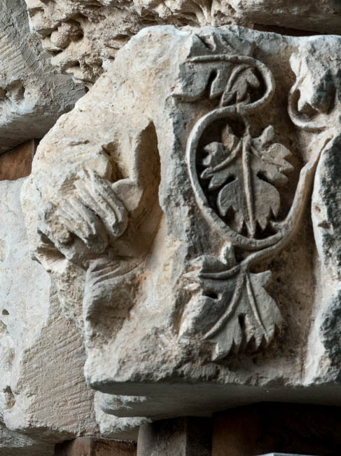 25755 Reliefblock mit vorkragendem Mittelteil, Akanthus- und Weinranken
