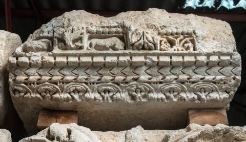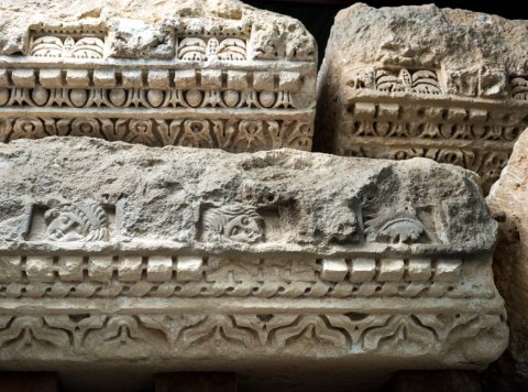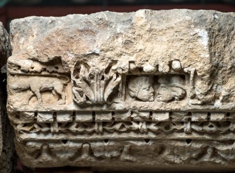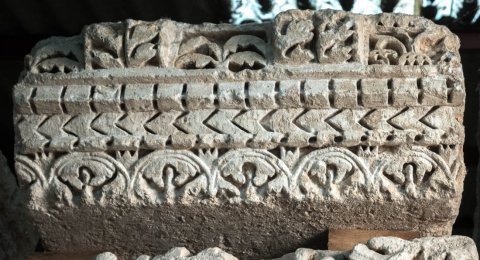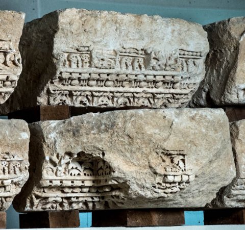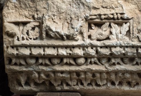 - Konsolgesims von einer Porticus, beidseitig ausgearbeitet. Kyma, Eierstab oder tordierter Stab und Zackenband, Zahnschnitt, Konsolen mit Akanthusblättern, dazwischen Ornament, Blattdekor und figürliche Reliefs (Masken, Tiere).
