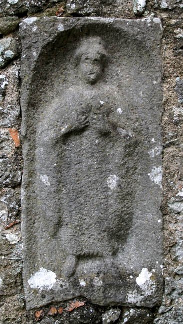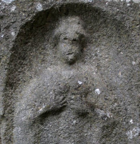 - in Bogennische stehende Frau mit zwei Attributen in den Händen