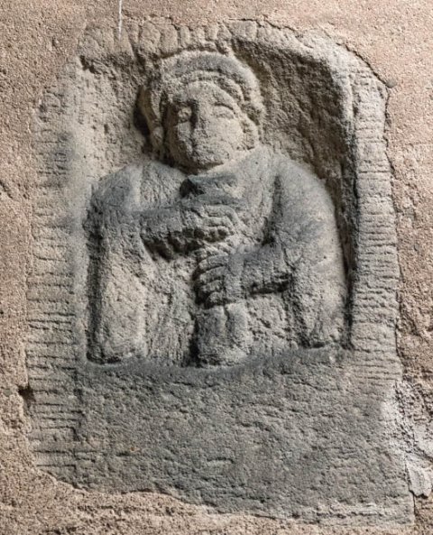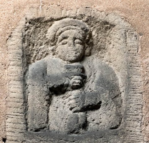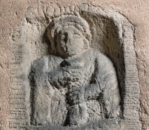 - Bogenische mit Halbfigur einer Frau in Ärmelkleid und Haube (?), in den Händen Becher und Flasche. Auf dem oberen Rahmen Inschriftreste.