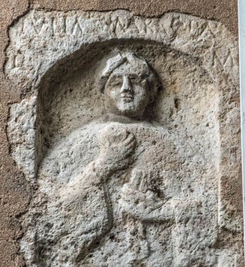 - In Bogennische Halbfigur einer Frau mit Apfel (Becher ?) in der Rechten, Tuch (mappa). in der Linken. Auf dem oberen Rahmen Inschrift.