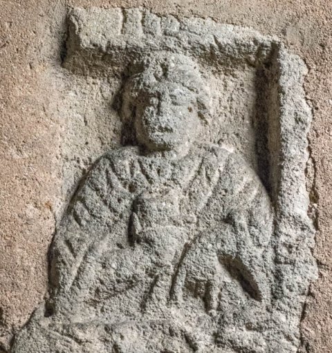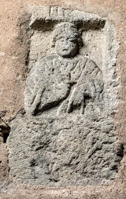 - In Rechtecknische Halbfigur einer Frau mit Gefäß und mappa in den Händen. Auf dem oberen Rahmen Reste einer Inschrift.