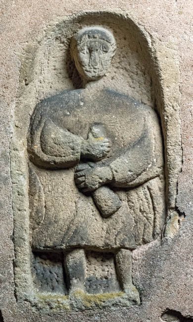 - In Bogennische stehender Mann im Ärmelgewand, in den Händen Becher und Flasche.
