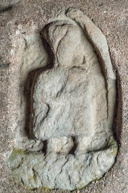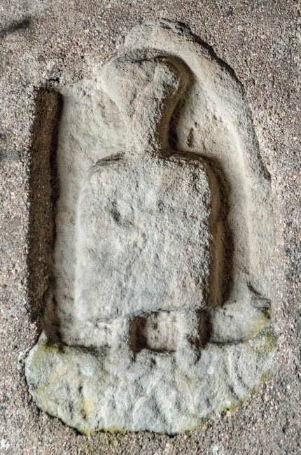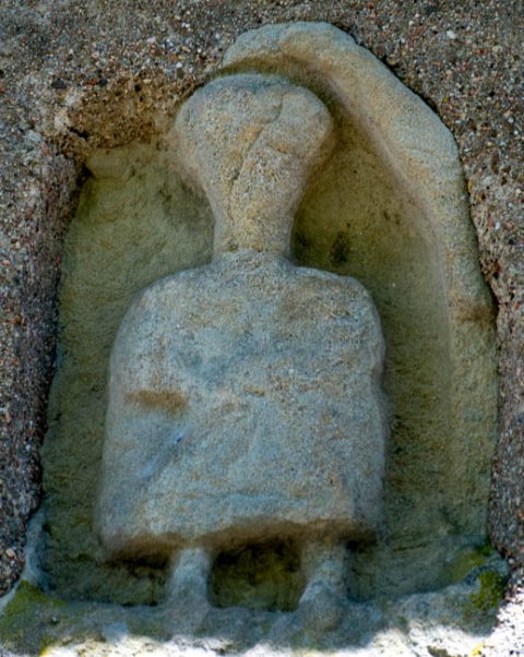 - in Bogennische stehende Ganzfigur im halblangen Gewand, in den Händen längeres stabförmiges Objekt.