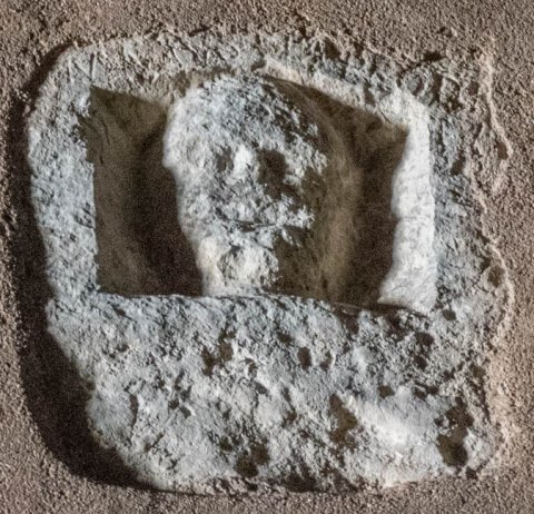- Nische mit offenem Giebel, darin menschlicher Kopf. Auf der Rahmenleiste oben Inschrifreste.