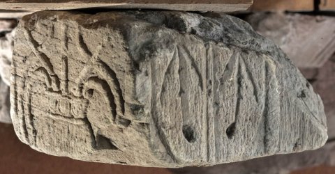 - Eckblock: auf einer Seite Krater mit stilisierten Ranken, auf der rechts anschließenden (Vorderseite ?) vertikale Rahmenleiste mit Blattdekor