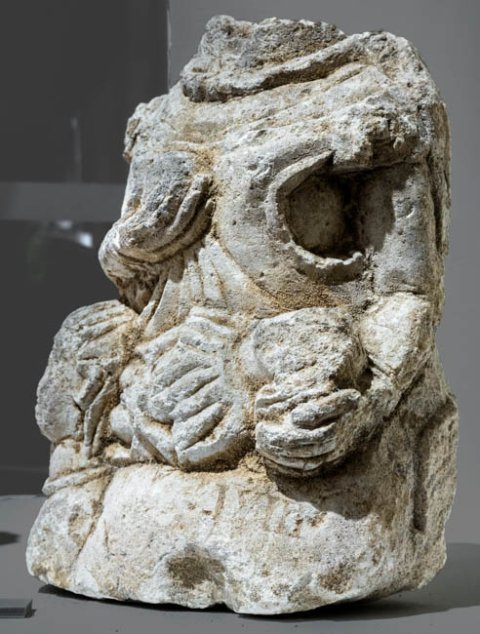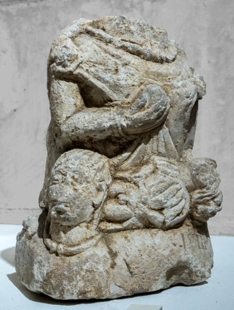 - Mythische Figur: Halbfigur eines sitzenden Mannes (Gott) mit Torques und Armreifen, an den Schultern Fibel mit Ringen (?), vor sich liegendes Kind mit entblößtem Unterkörper. Vor dessen Beinen Büste eines bartlosen Mannes mit Torques.