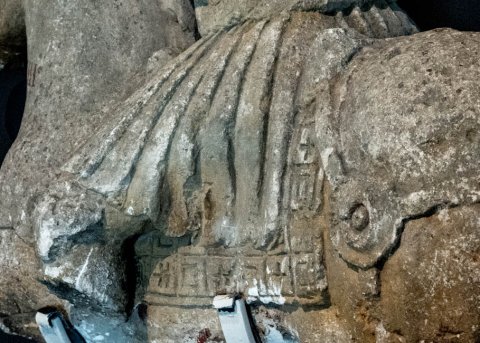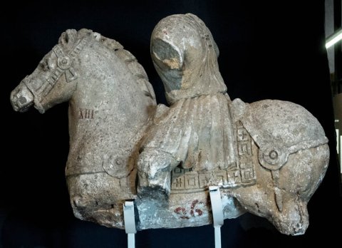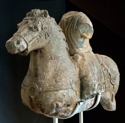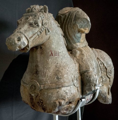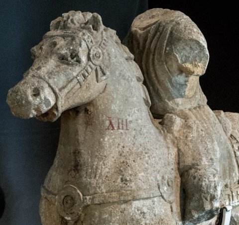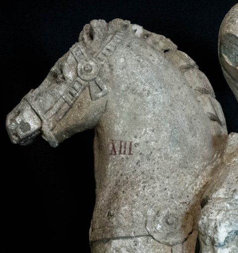 - Kopf, Arme, rechter Fuß, linker Unterschenkel des Reiters, Beine u. Teil des Hinterteils mit Schwanz des Pferdes abgebr.