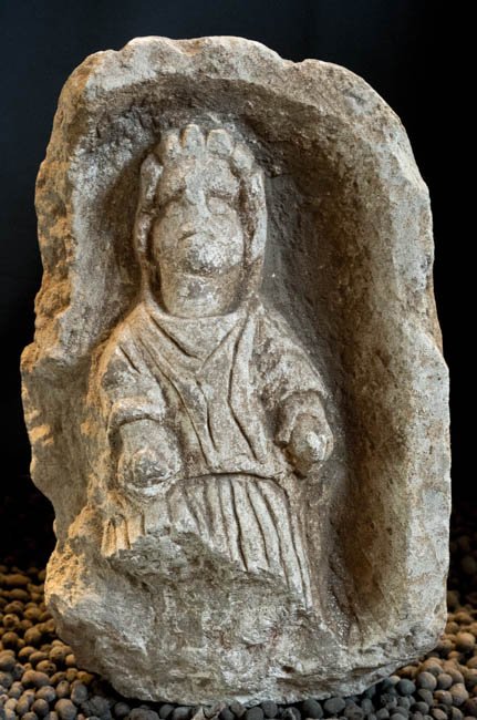 - in Bogennische stehende Frau in gegürteter Tunica, in den Händen Attribute